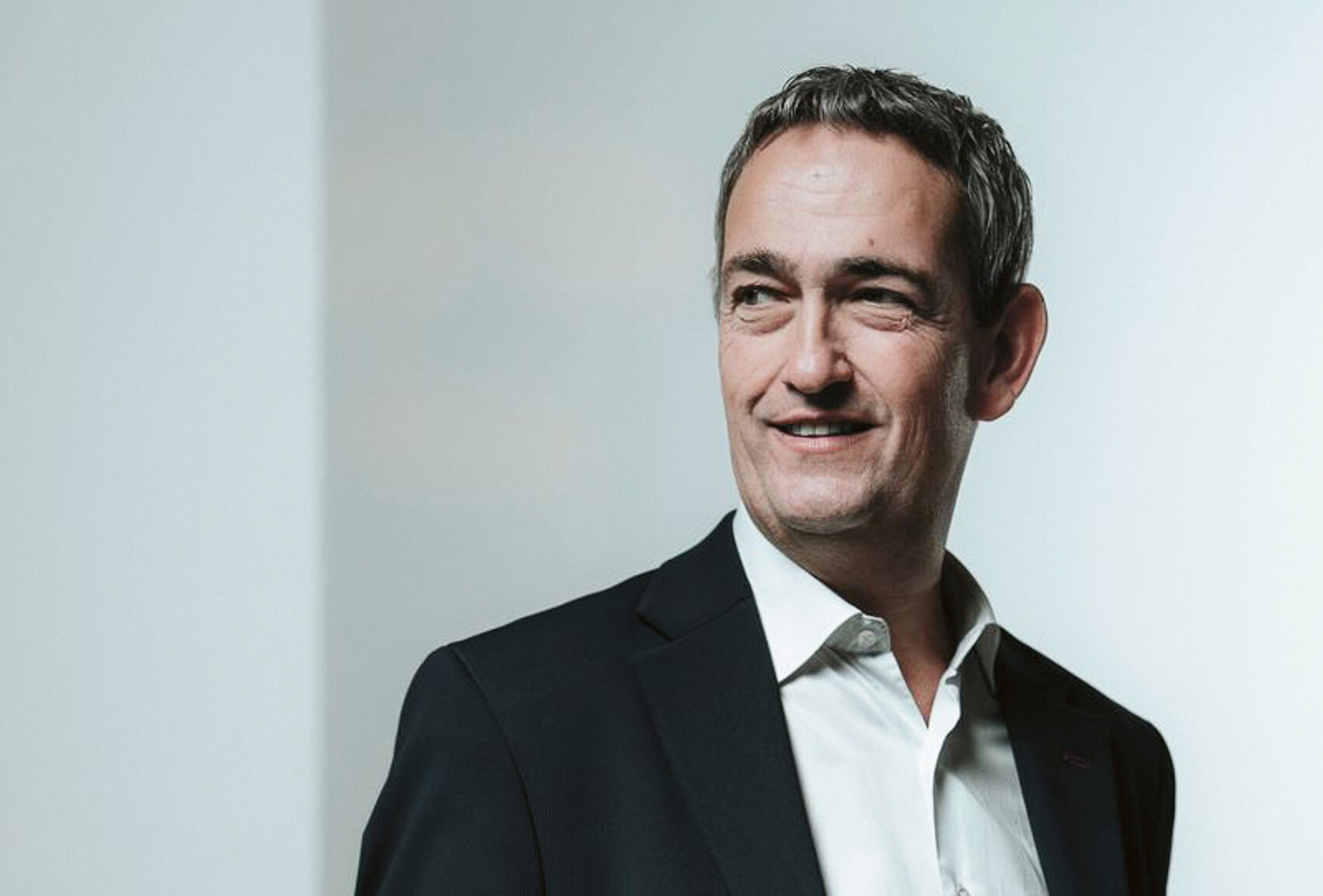 Ein Mann in einem dunklen Anzug und weißem Hemd steht lächelnd vor einem hellen, minimalistischen Hintergrund und schaut zur Seite.